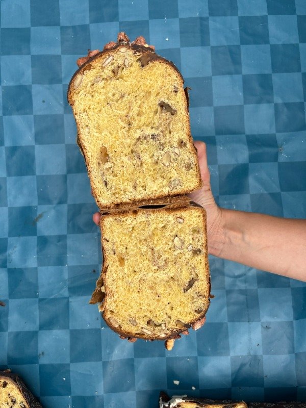 Pan dulce con frutos secos (nueces y almendras) bañado en choco semi amargo y almendras garrapiñadas. Pesa 550 grs